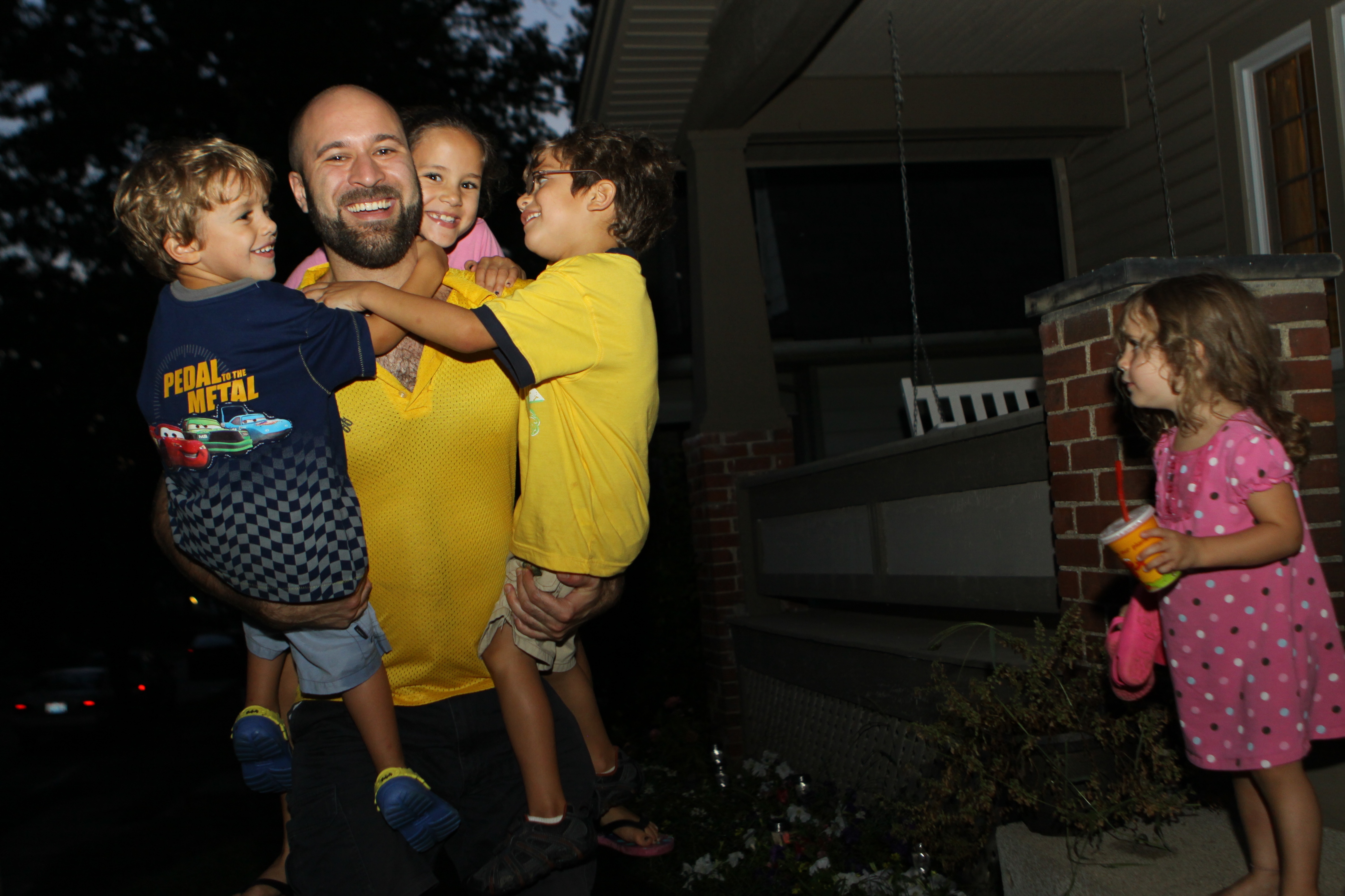 A flash in the dark.  I try to use available light most times and avoid flash.   Uncle Matty in from Zagreb with an armful of two nephews and a niece. Jack, Anna and Michael.  Maura Clare looking on from the front porch steps at La and James’ home.