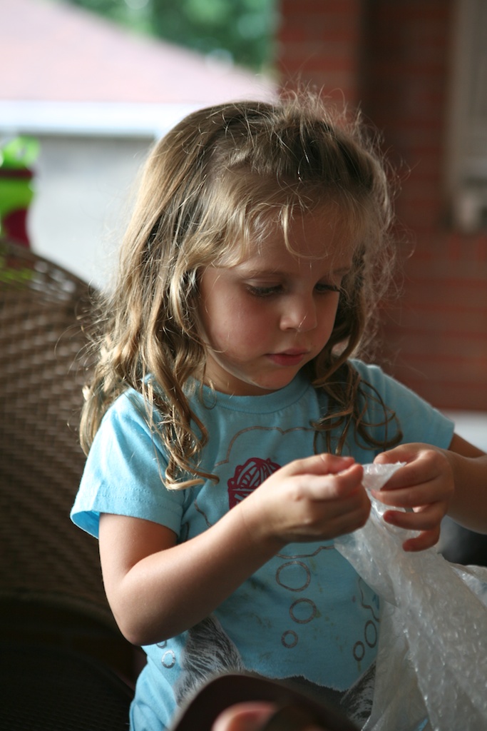 You don’t have to explain the rules to this activity. Here’s Maura on Aunt Linda’s back porch, concentrating on the task.  A detailed post of various methods of popping bubble wrap has been published over at 1000 Awesome Things( #840) so check it out here. There’s a photo of someone jumping on a big sheet of it! And there are various size bubbles.