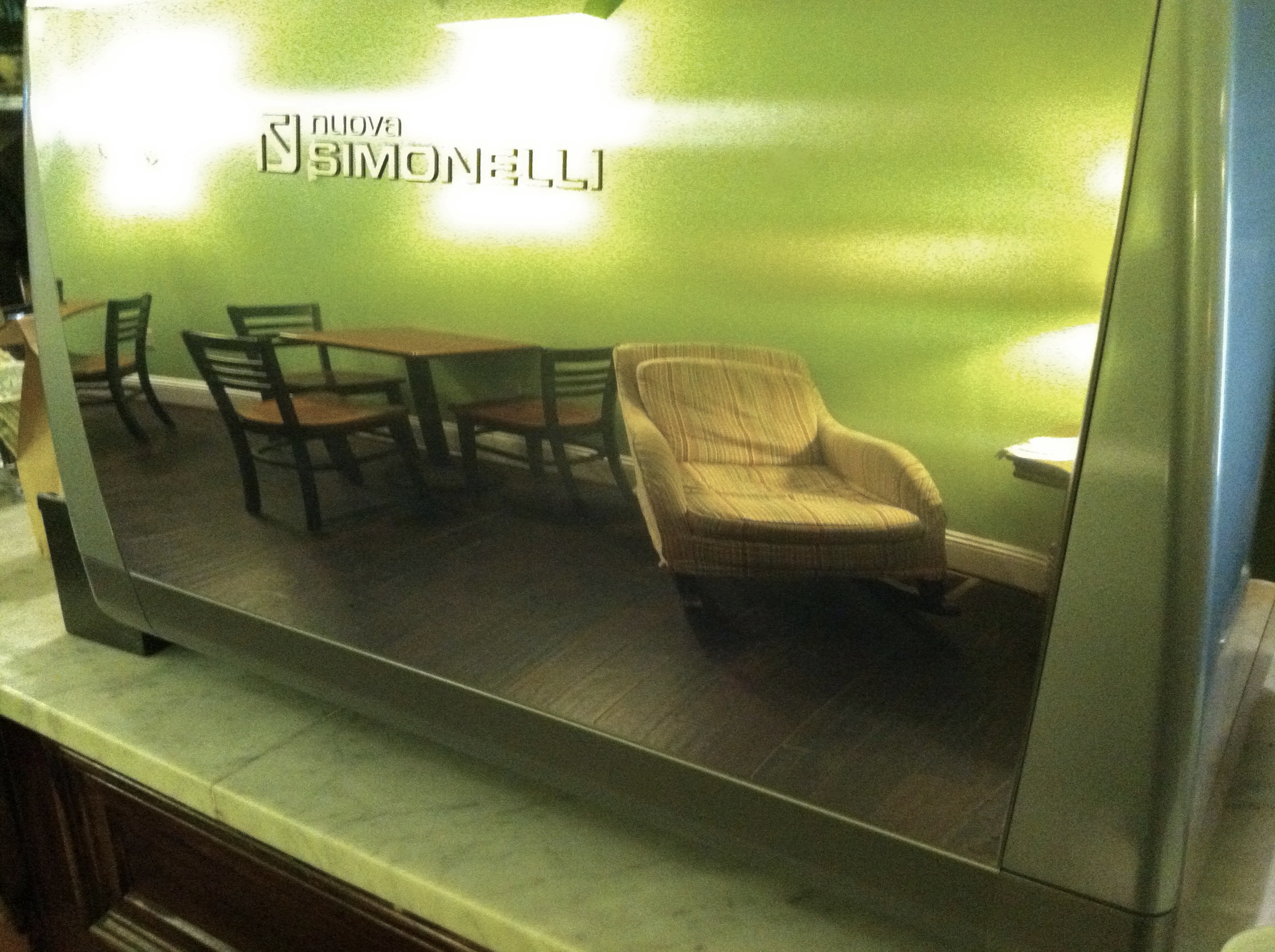 It is a stunning and shining beauty of an Espresso machine, the Nuova Simonelli. And as I stood waiting for my coffee, I noticed the reflection of the chairs and wall. I read that they are getting ready to put up some new art so I caught it on a plain green wall day.