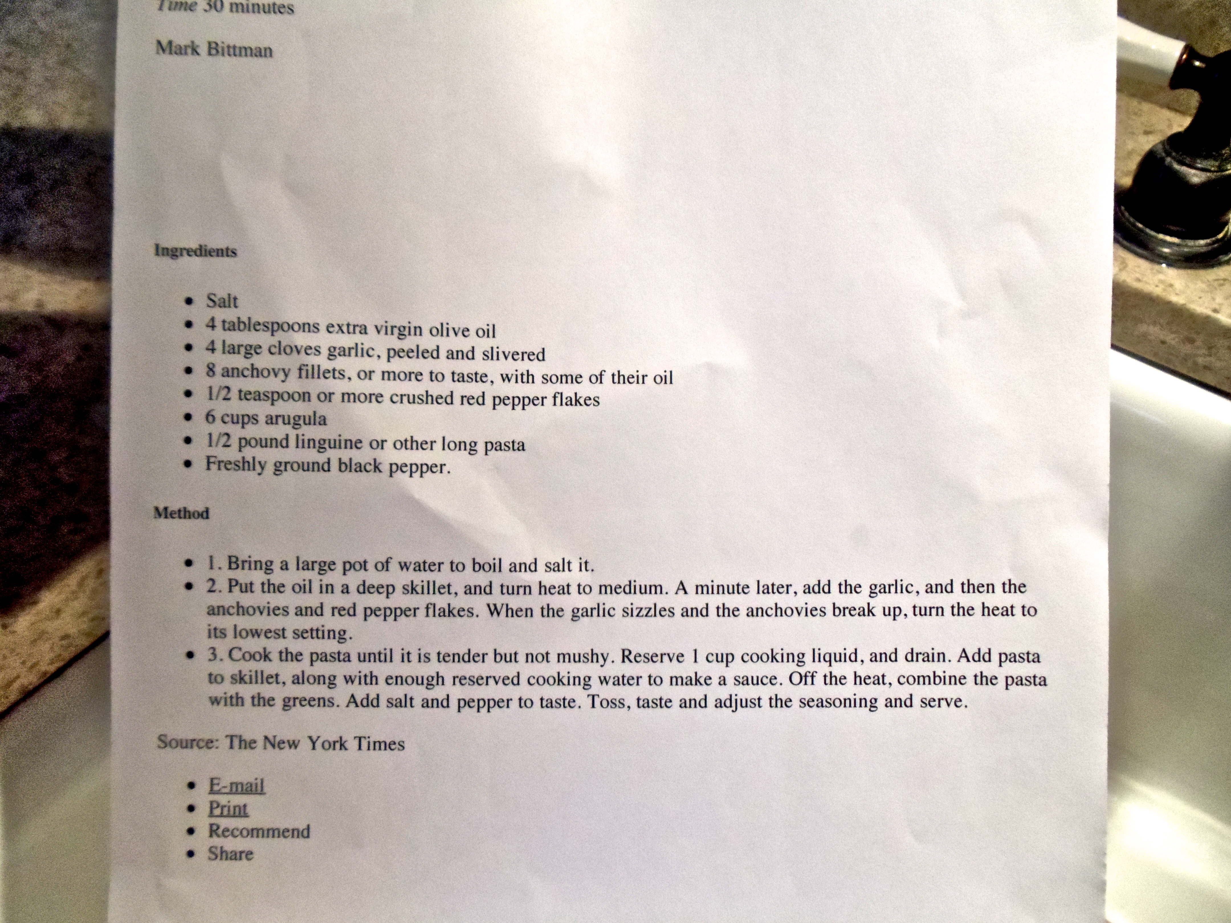 Mark Bittman -Minimalist: Pasta with Anchovies and Arugula article and video in the New York Times